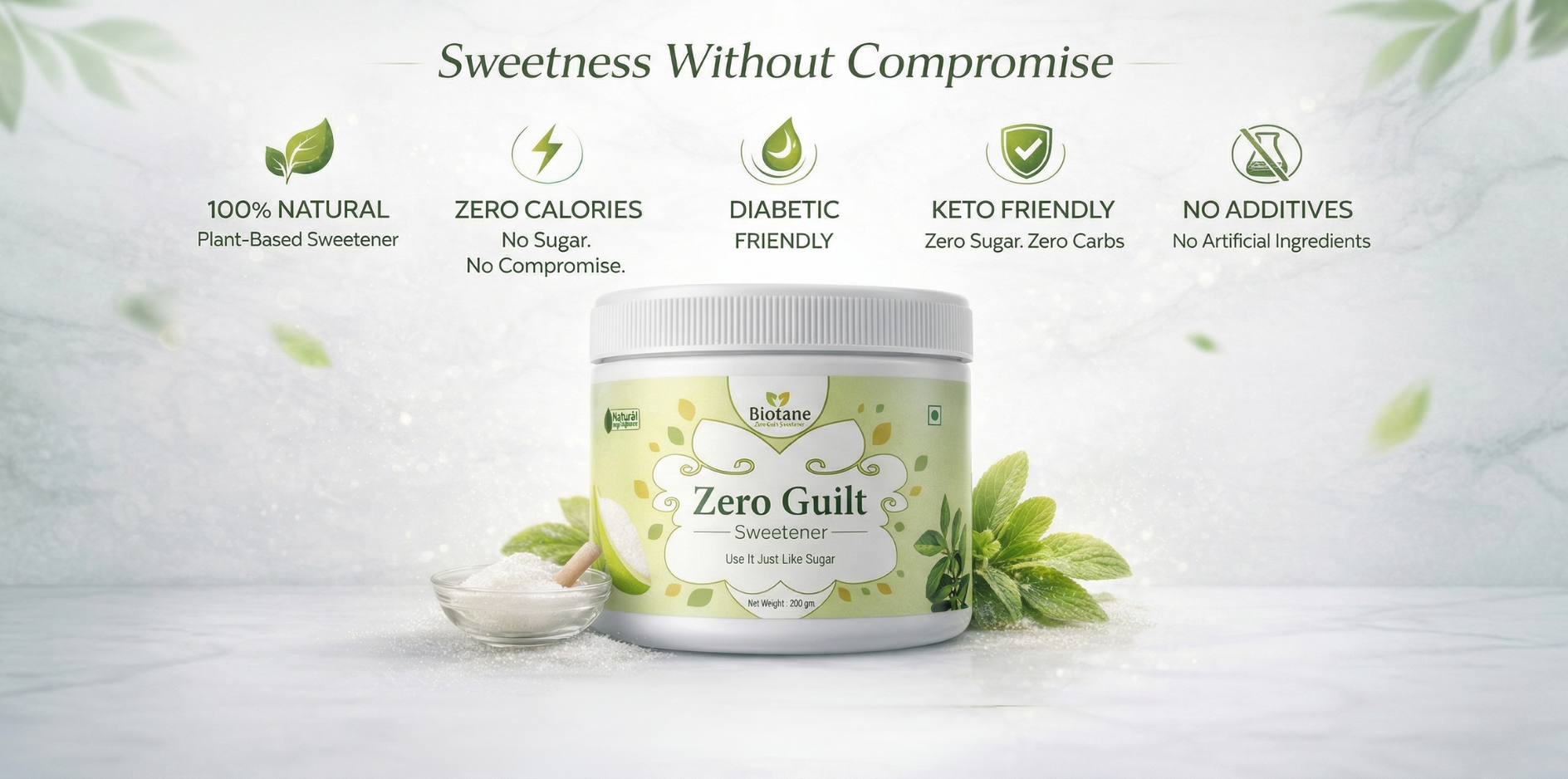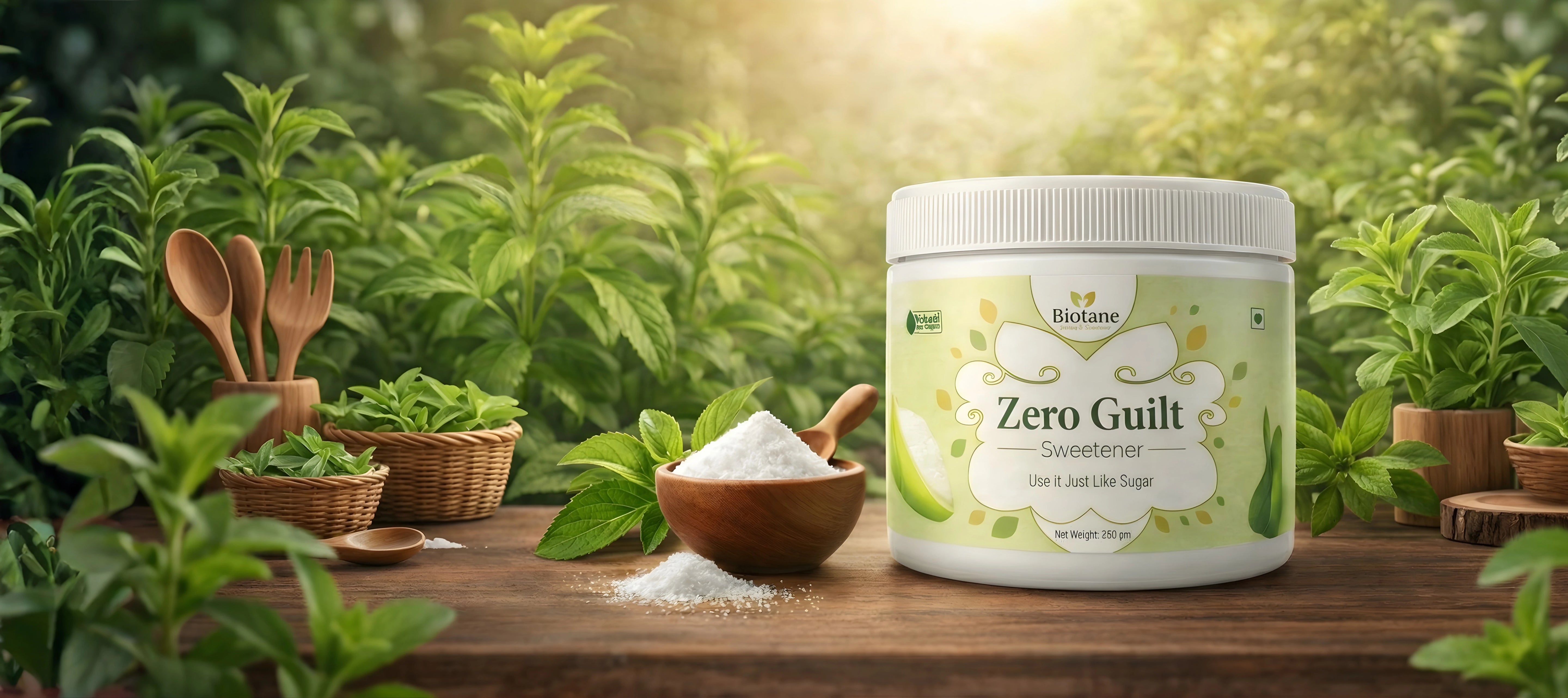 Biotane Zero Guilt Sweetener is a natural, zero-calorie way to replace your sugar. Use it exactly 1:1 for baking, cooking and drinks with no bitter aftertaste guaranteed.