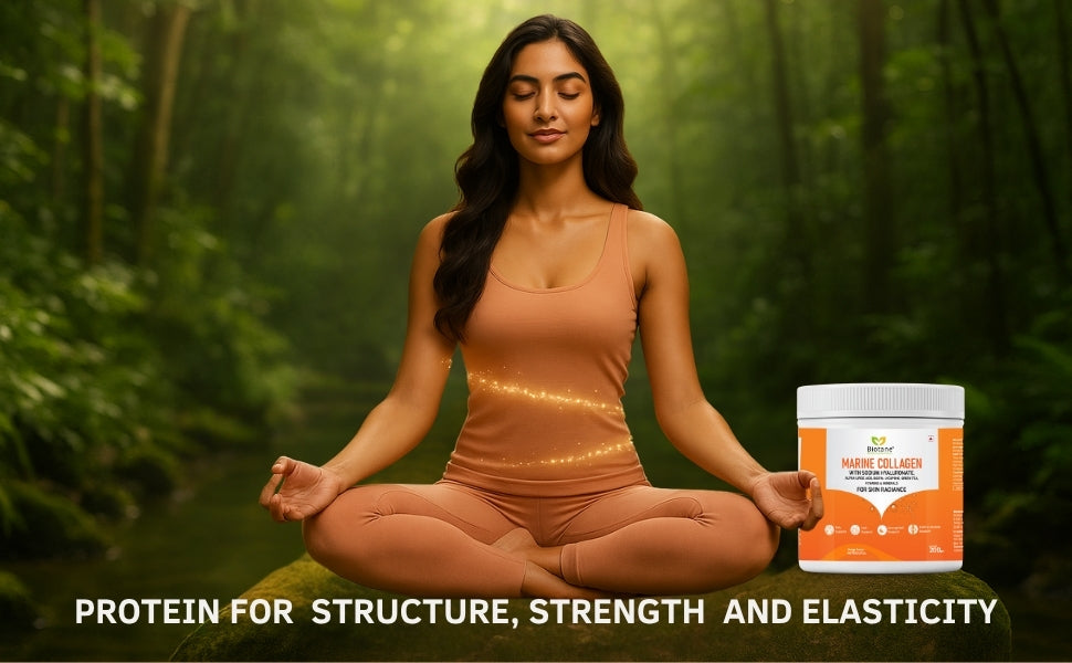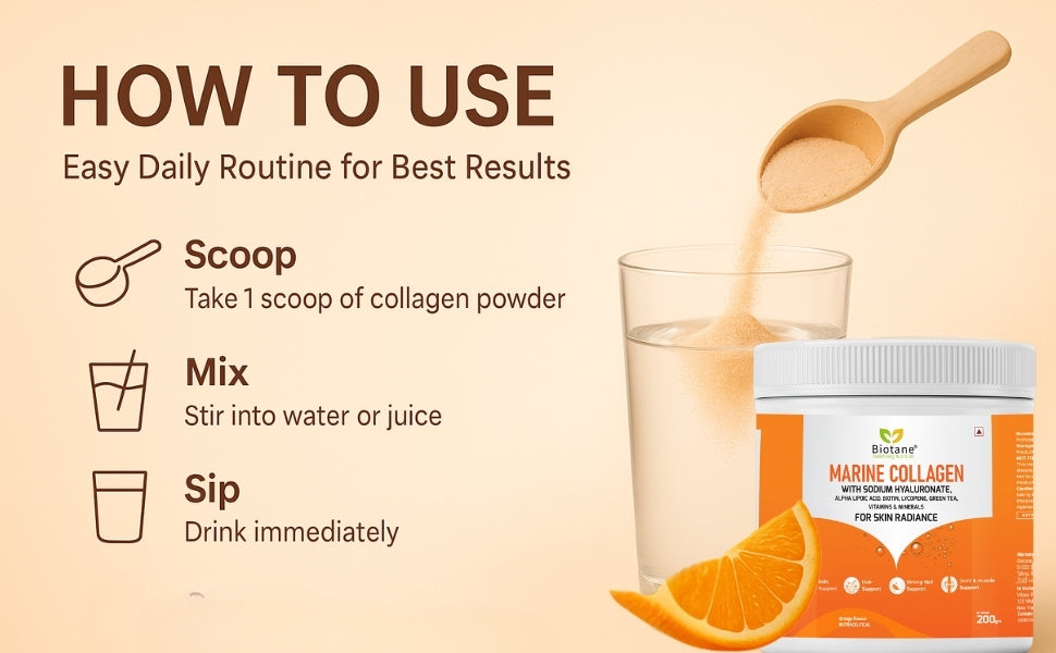 Marine Collagen, Biotin, Sodium Hyaluronate, Vitamin E, Vitamin C, Alpha Lipoic Acid, Lycopene, Zinc Sulphate, Green Tea Extract, Dicalcium Phosphate, Diluent (INS 1405), Sodium Benzoate (INS 211), Natural Identical Flavour (Orange), Natural Colour.
