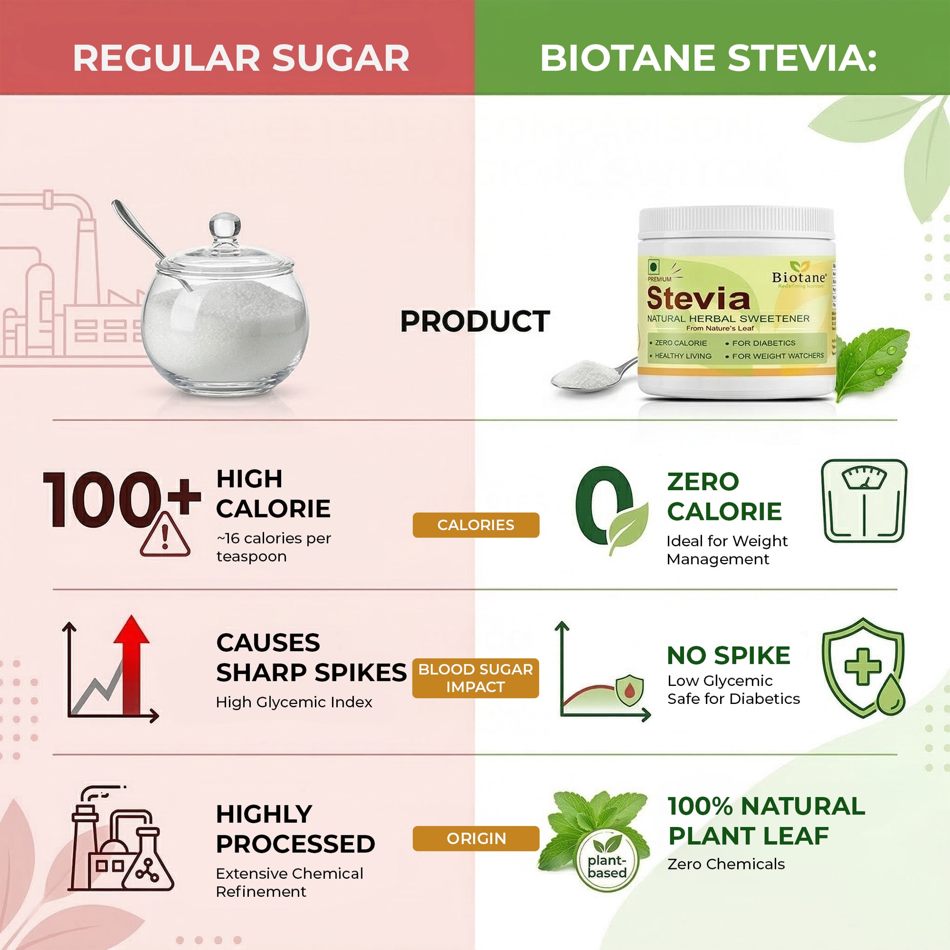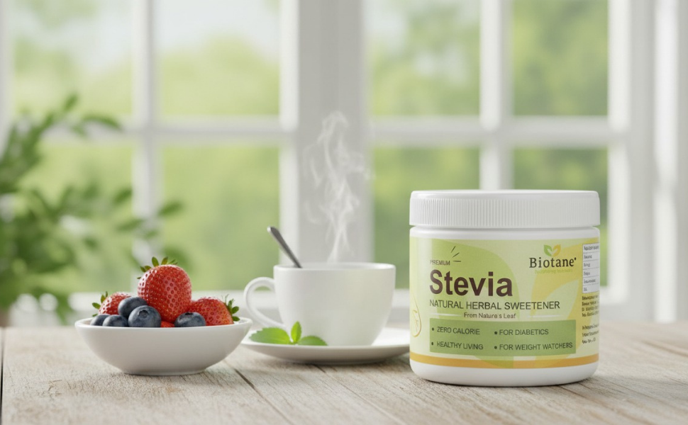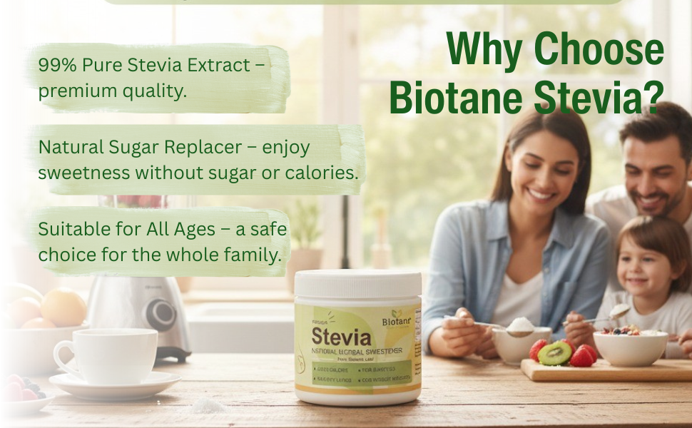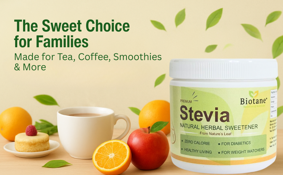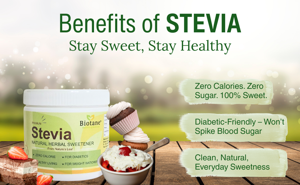 Biotane Premium Stevia is a natural, zero-calorie sweetener crafted from 99% pure Stevia extract. Unlike many other sweeteners, it delivers a sugar-like taste without any aftertaste. Natural Sugar Replacer.